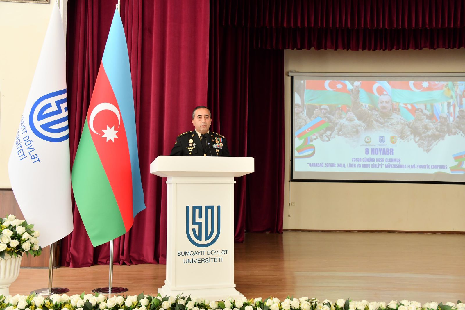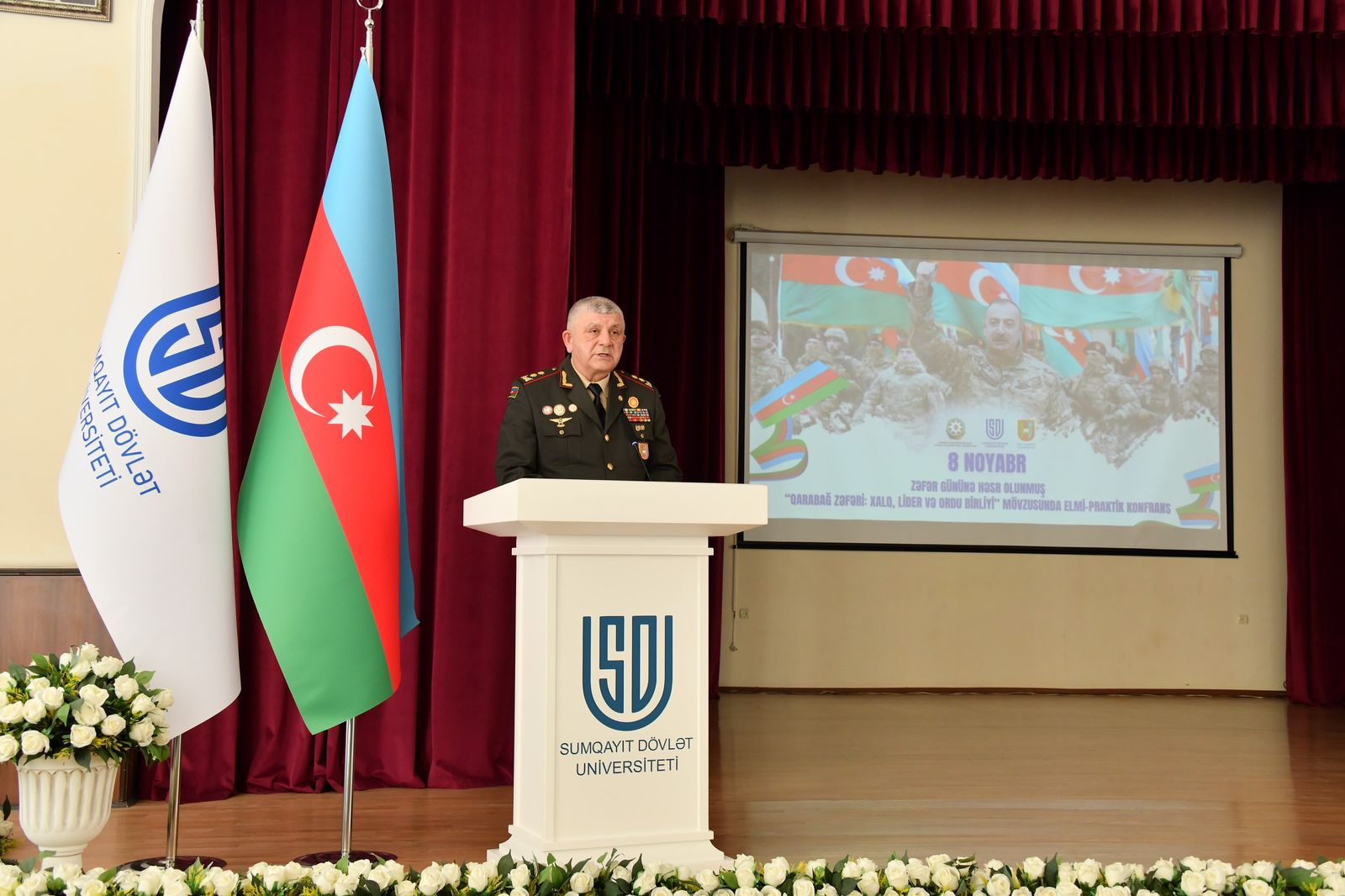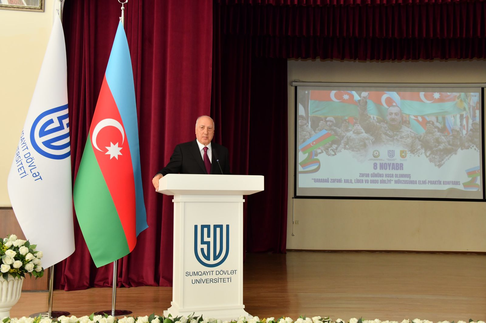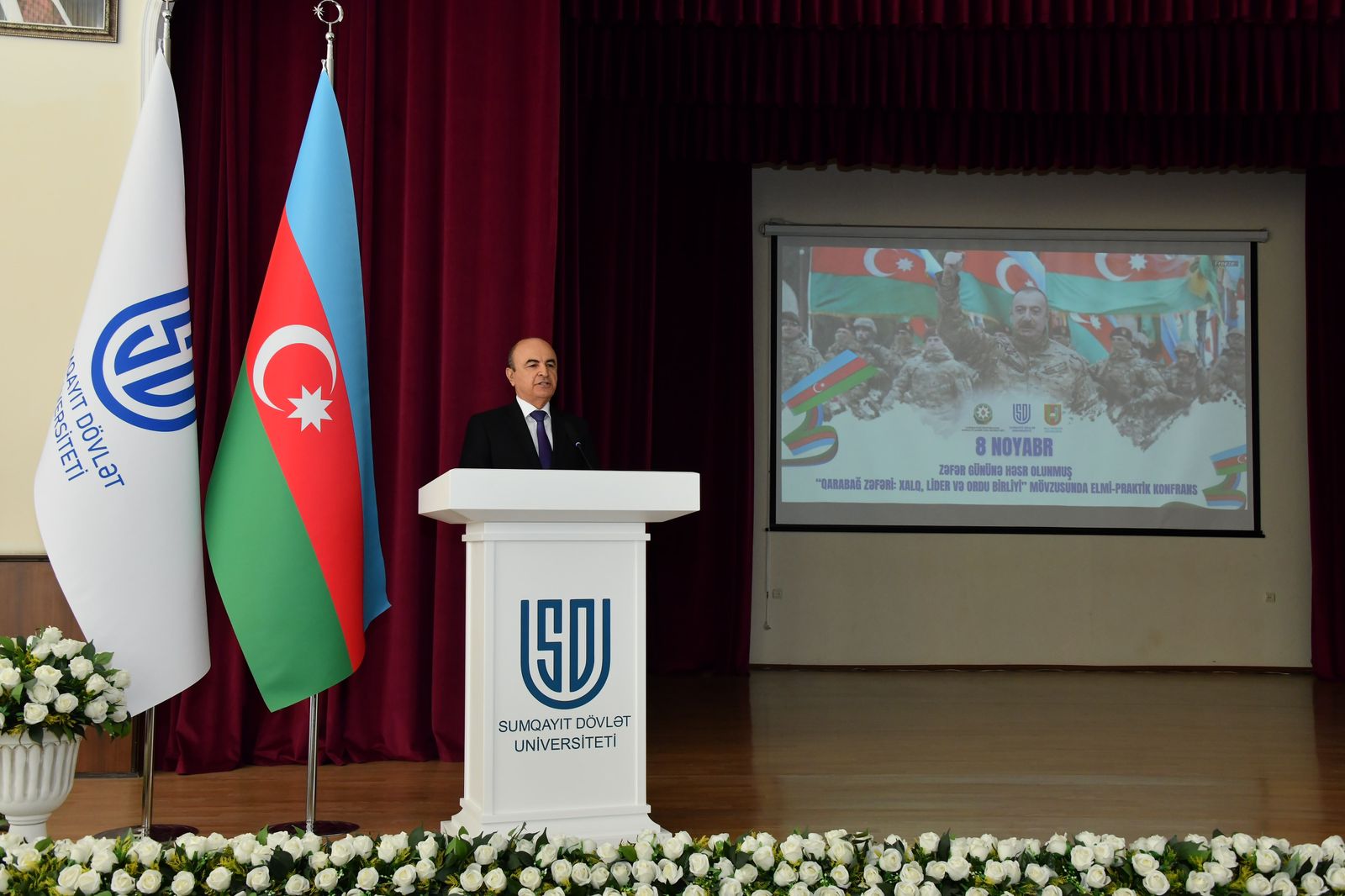 Noyabrın 7-də Sumqayıt Dövlət Universitetidə (SDU) Sumqayıt şəhər İcra Hakimiyyəti və Milli Müdafiə Universiteti ilə birgə Zəfər Gününün beşinci ildönümünə həsr olunmuş “Qarabağ zəfəri: xalq, lider və ordu birliyi” mövzusunda elmi-praktik konfrans keçirilib. Konfransda Sumqayıt Dövlət Universitetinin rəhbərliyi, professor-müəllim heyəti və tələbələr, həmçinin Sumqayıt şəhər İcra Hakimiyyətinin başçısı Zakir Fərəcov və Milli Müdafiə Universiteti rektorunun müşaviri general-leytenant Heydər Piriyev və digər yüksək rütbəli zabitlər, Sumqayıt hərbi prokuroru ədliyyə polkovniki Ağakişi Acalov, Səfərbərlik və Hərbi Xidmətə Çağırış üzrə Dövlət Xidmətinin Sumqayıt şəhər Baş İdarəsinin rəisi, general-mayor Natiq Qarayev, Vətən müharibəsi qəhrəmanı, polkovnik Raqif İsrayılov, şəhid ailə üzvləri iştirak ediblər.