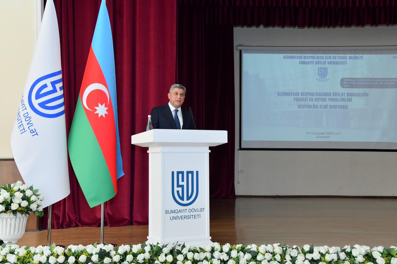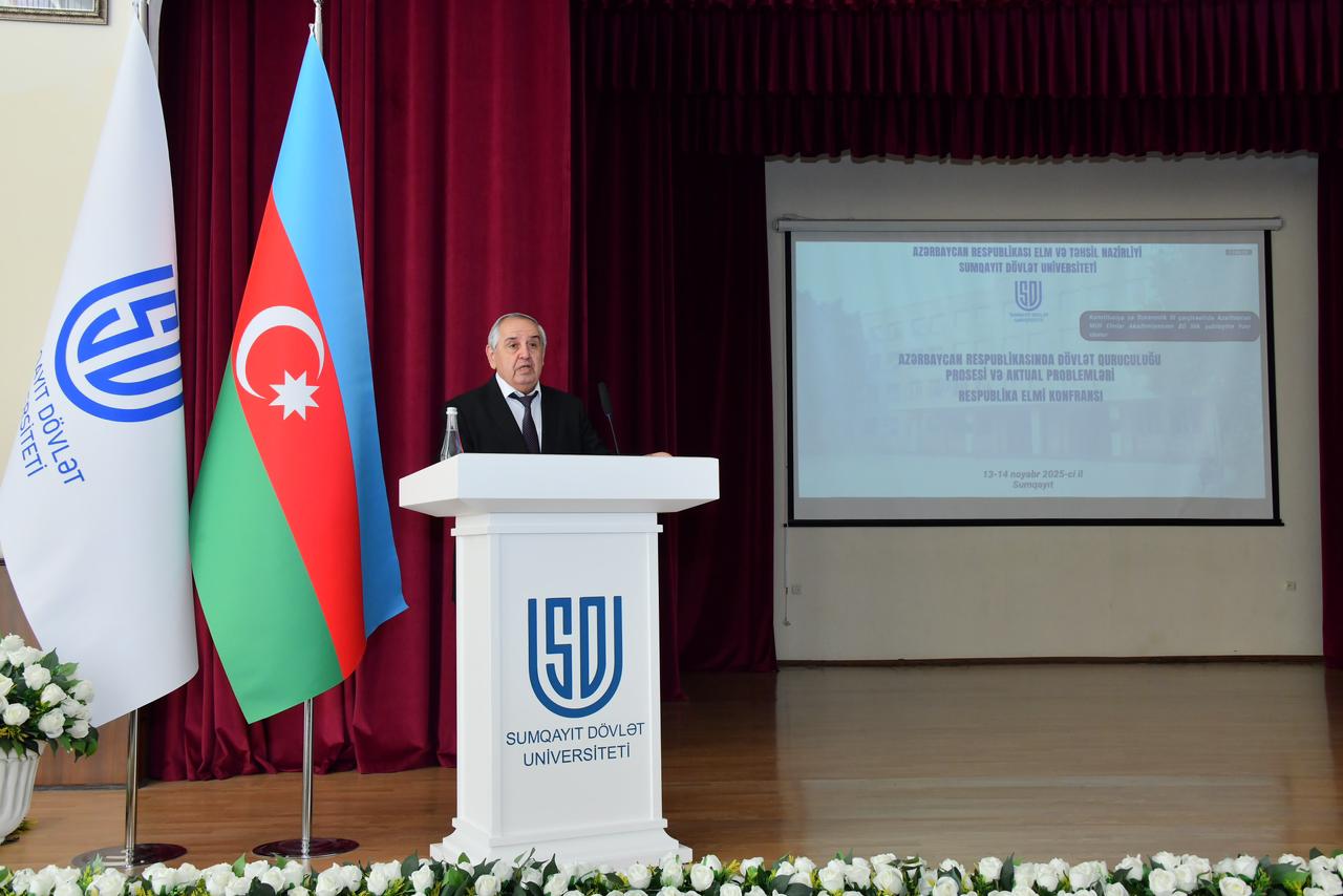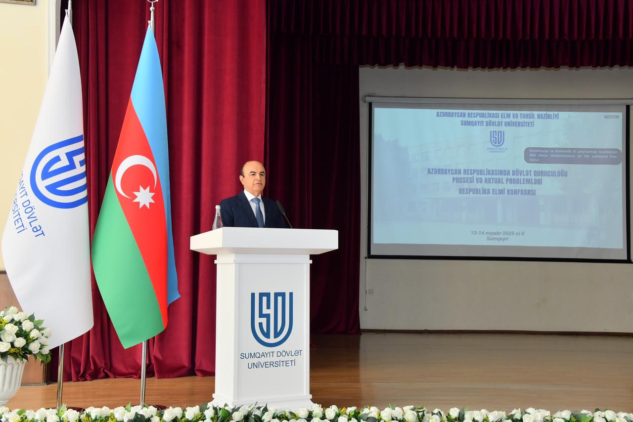 Noyabrın 13-də Sumqayıt Dövlət Universitetində (SDU) “Konstitusiya və Suverenlik İli” çərçivəsində “Azərbaycan Respublikasında dövlət quruculuğu prosesinin aktual problemləri” mövzusunda Respublika elmi konfransı keçirilib. Konfrans Azərbaycan Milli Elmlər Akademiyasının (AMEA) 80 illik yubileyinə həsr olunub. Konfransda Sumqayıt Apellyasiya Məhkəməsinin sədri, Azərbaycan Respublikasının Məhkəmə-Hüquq Şurasının üzvü Tofiq Paşayev, Azərbaycan Milli Elmlər Akademiyasının akademik-katibi, akademik Arif Həşimov, respublikanın aparıcı ali təhsil müəssisələrinin nümayəndələri, Sumqayıt Dövlət Universitetinin rəhbərliyi, professor-müəllim heyəti, doktorant və magistrantları iştirak ediblər. Konfrans iştirakçıları əvvəlcə Ümummilli Lider Heydər Əliyevin universitetin foyesində ucaldılmış büstü önünə gül dəstələri qoyublar.